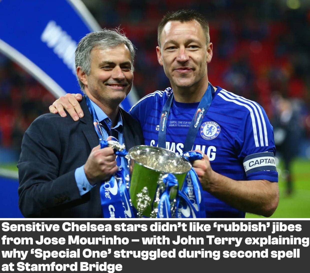 GOAL网站报道,切尔西名宿、前队长特里解释了为什么穆里尼奥在第二次执教切尔西时苦苦挣扎的原因。特里坦言,当时很多切尔西球星比较敏感,他们不喜欢穆里尼奥嘲讽式的激励。特里认为,穆里尼奥一直没有变,改变的是时代,是球员。