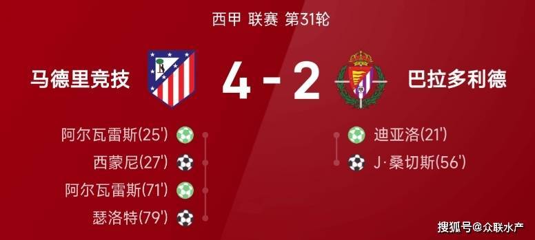 比赛进入到第79分钟,马竞再次发起攻势。右路传中准确找到阿尔瓦雷斯,然而他的射门被对方门将扑出。幸好,瑟洛特及时跟进,在小禁区线上补射破门,马竞以4-2扩大了优势。巴拉多利德几乎失去了翻盘的希望,而马竞也顺利守住了胜果。