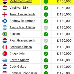 #维尔茨 #利物浦 #麦卡利斯特 #基耶萨 #萨拉赫 #周薪 #范迪克 #球员 #年薪
