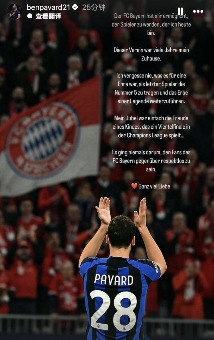 直播吧4月18日讯 国际米兰在欧冠1/4决赛两回合以总比分4比3将拜仁淘汰出局。其中拜仁旧将帕瓦尔在次回合打进关键一球,赛后他通过社交媒体向拜仁球迷致歉。